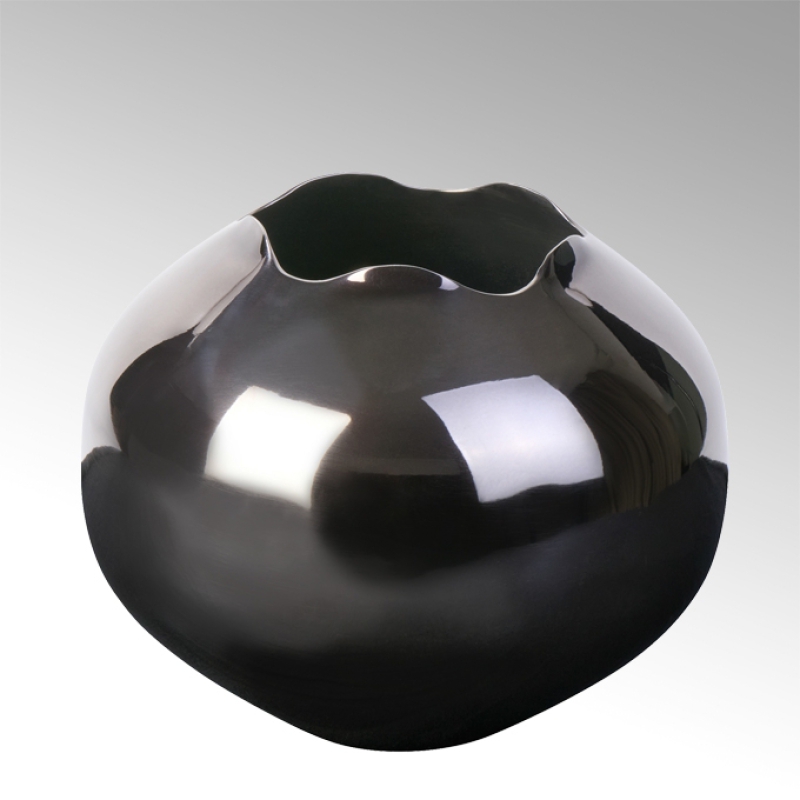 Die Natur ist einfach der beste Designer. Bei dem dekorativen Gefäß Myrtille ließ sich die Designerin von der kraftvollen Form einer vor Saft fast platzenden Blaubeere inspirieren. Die blauschwarz schimmernde Vernickelung unterstreicht die Form der Maxifrucht im Besonderen. Das Gefäß wird in Handarbeit Stück für Stück bearbeitet und poliert bevor es in das Galvanisierungsbad übergeht. Myrtille ist für sich schon ein dekoratives Kunstwerk. Mit Zweigen und Blättern geschmückt wird sie zu einem Highlight. Das Metallgefäß eignet sich nicht zum Befüllen mit Wasser. Bitte nehmen Sie einen passenden Einsatz aus Glas oder Kunststoff, wenn Sie Myrtille als Vase benutzen wollen.