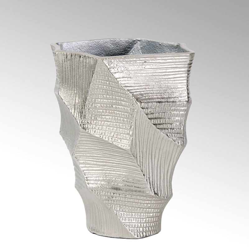 Die Naoki Gefäße sind ein kleines, handwerkliches Kunstwerk. Inspiriert von japanischen Holzschnitzereien wurde von einem Kunsthandwerker erst eine Urform hergestellt, nach der jedes Gefäß im Sandguss ausgegossen wird. Naoki steht als Schmuckstück auf dem Tisch oder dem Sideboard. Trockene Zweige und Blumen lassen sich in diesem Gefäß dekorieren. Für Frischblumen sollte immer ein Kunststoffeinsatz verwendet werden. Die Mineralien unseres Wassers können mit der Zeit die Metalloberfläche angreifen und durchlässig machen. Zur Pflege empfiehlt sich ein feuchtes weiches Tuch und evtl. etwas Spülmittel. Kratzende Putzschwämme hinterlassen Kratzer auf der Oberfläche.