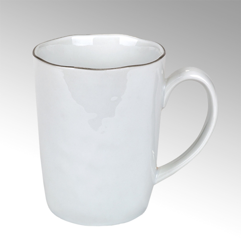 Maße: ø 8,5 cm, H 11 cm Material: Porzellan, Dekor Rand Farbe: weiß / grau VPE: je 12 Stück -