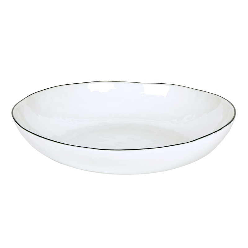 Maße: ø 33 cm, H 6 cm Material: Porzellan, Dekor Rand Farbe: weiß / basalt -