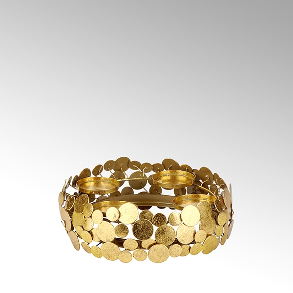 Größe: ø 33 cm, H 11 cm, für Kerze ø 8 cm Material: Eisen / Blattmetall Farbe: gold -
