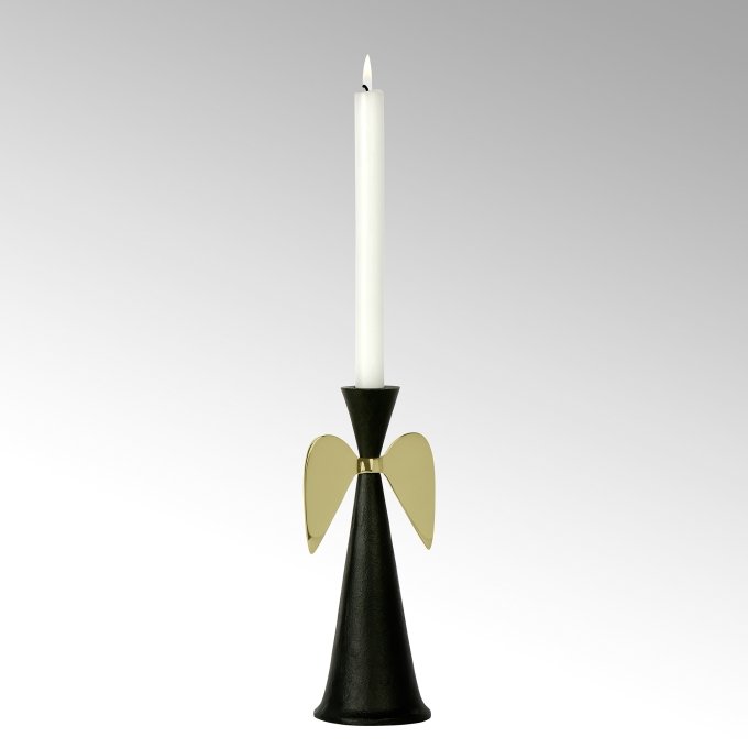 Engel gibt es seit tausenden von Jahren in allen monotheistischen Kulturen. Vornehmlich stehen sie ein für Sicherheit und Schutz. Nanael trägt außerdem das Licht auf Ihre weihnachtliche Tafel. Dieser Kerzenhalter wird in stilisierter Form im Sandgussverfahren aus Aluminium gegossen und erhält eine schwarze Patina. Diese steht im spannenden Kontrast zu seinen glänzend polierten Flügeln im Nickelfinish. Auch außerhalb der Weihnachtszeit ist Nanael damit ein besonderes Unikat, das in jedes Wohnambiente passt. Wachsreste dürfen nicht mit scharfen Gegenständen entfernt werden, diese zerkratzen die Oberfläche. Es empfiehlt sich, warmes Wasser, etwas Spülmittel und einen weichen Lappen hierfür zu nutzen.