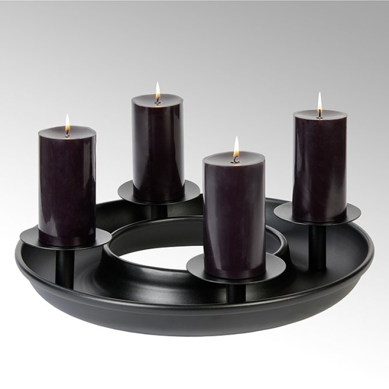 Ein Lambert Klassiker in neuer und moderner Interpretation. Der Saturnia Festkranz ist mit vier Kerzen zu bestücken. Der pulverbeschichtete schwarze elegante Kranz mit seinen großzügigen Proportionen ist nicht nur zur Adventszeit ein besonderer Schmuck für die Tafel. Auch zu anderen Gelegenheiten mit ein paar frischen Efeublättern oder mit Blüten belegt, setzt er den Festtisch ins richtige Licht. Heißes Kerzenwachs kann vorsichtig mit warmem Wasser und einem weichen Tuch entfernt werden, generell sollte Saturnia nicht mit schleifenden und kratzenden Schwämmen gereinigt werden.