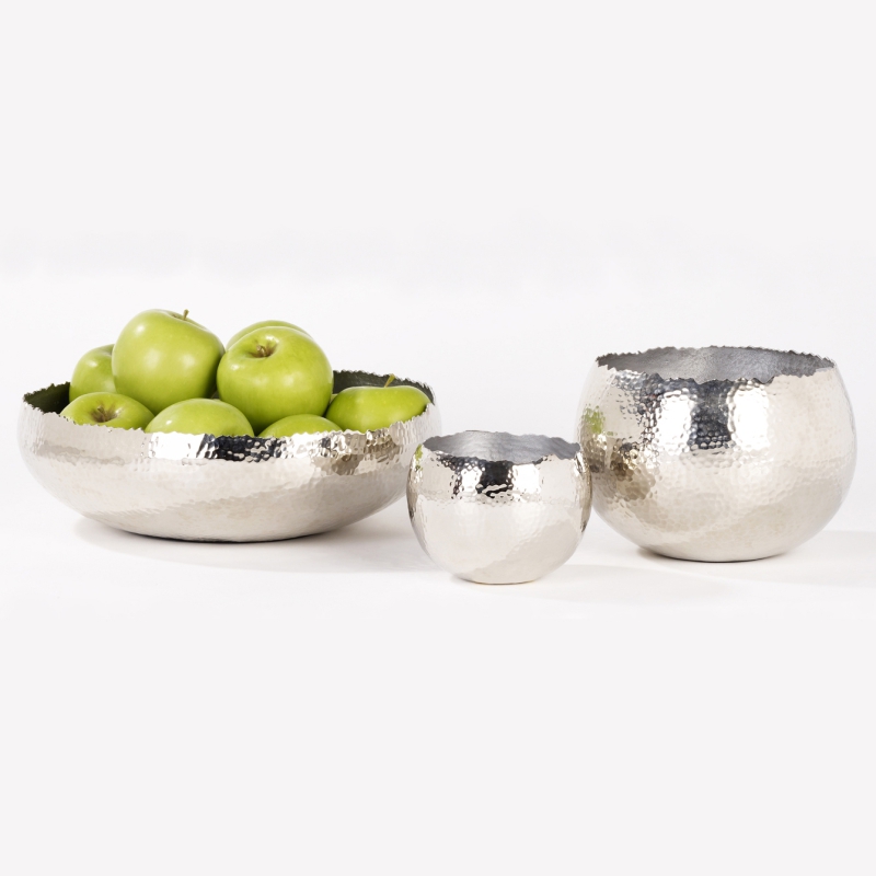 An riesige aufgebrochene Eierschalen erinnern die neuen Dino Objekte. Aus Stahl wird jede einzelne Schale von Hand getrieben, in der Oberfläche ähnlich wie ein Straussen-Ei mit einer fein gehämmerten unregelmäßigen Struktur versehen und dann poliert. Der Rand wird ebenfalls gänzlich in seiner Zackenlinie von Hand bearbeitet. Dies bedeutet sehr sensible Feinarbeit für den Handwerker in jeder Zacke nachzupolieren und die Kante zu brechen. Erst nach all diesen Vorarbeiten kann das Werkstück in die Vernickelung gehen. Dino ist nicht nur dekorativ, man kann Früchte, Nüsse und Kekse darin aufbewahren. Für Salate und feuchte oder säurehaltige Lebensmittel eignen sich vernickelte Oberflächen allerdings nicht.