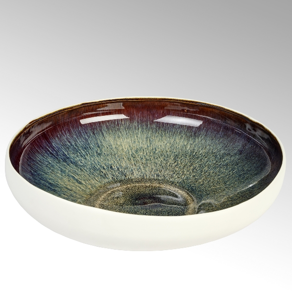 Große Schüsseln und Schalen erfüllen nicht nur einen dekorativen Zweck sondern sind in jedem Haushalt einfach unerlässlich. Die Takeo Schalen in eindrücklicher Größe sind elegant und dennoch altagstauglich. Das hochgebrannte Keramikmaterial ist zwar fein aber dennoch stabil und nimmt vom Salat bis zur Familienpasta alles gerne auf. Die Schalen sind aussen mit einer feinen Mattglasur versehen und zeigen ihr Innenleben mit einer aufregend gefärbten und individuell verlaufenden Reaktivglasur. Die besondere Eigenschaft einer Reaktivglasur besteht in ihrem unregelmäßigen Verlauf. Ausgelöst durch der Glasur beigefügte unterschiedliche Mineralien, ergeben sich im Brand individuelle Farbverläufe die die Oberfläche interessant gestalten. Takeo ist spülmaschinengeeignet.Maße: H 10 cm, ø 44,5 cm Material: Keramik Farbe: mystic topas -